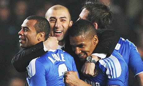 Chelsea interim manager Roberto Di Matteo, second left, celebrates with Ashley Cole, left, Florent Malouda, centre and Frank Lampard after the win over Napoli Photo: Tony O'Brien/Action Images